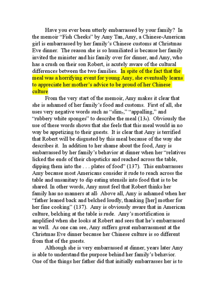 Then my father poked his chopsticks just below the fish eye and plucked out the soft meat. While we are happy to answer general food safety questions, we're less comfortable with questions the stuff you want to pick out from fish heads are the cheeks and eyeballs. Amy, your favorite, he said, offering me the tender fish cheek. Start studying fish cheeks answers. The short narrative discusses an. For the following questions, choose the best how answer or respond in complete sentences. Interactive unit that encourages students to evaluate the effect of the inclusion of figurative language in amy tan's nonfiction narrative. Fish cheeks doesn't aspire to the worldwide recognition nahm has won. Learn vocabulary, terms and more with flashcards, games and other study tools. Amy should not be embarrassed about her culture. The very short story fish cheeks has several purposes. 1 i fell in love with the minister's son the winter i turned fourteen. Reprinted with permission, all rights reserved.